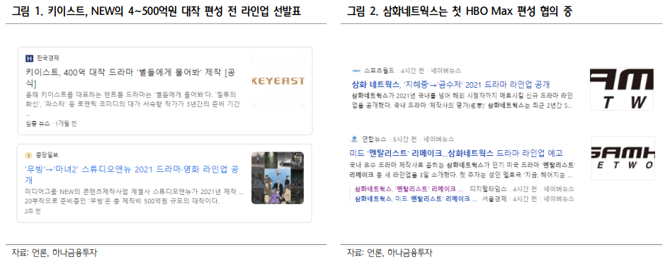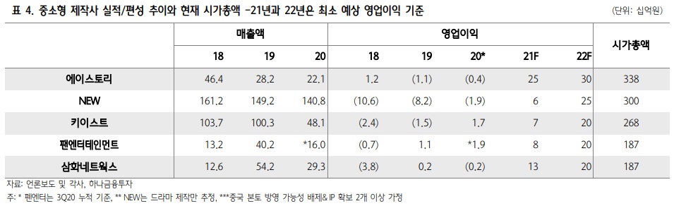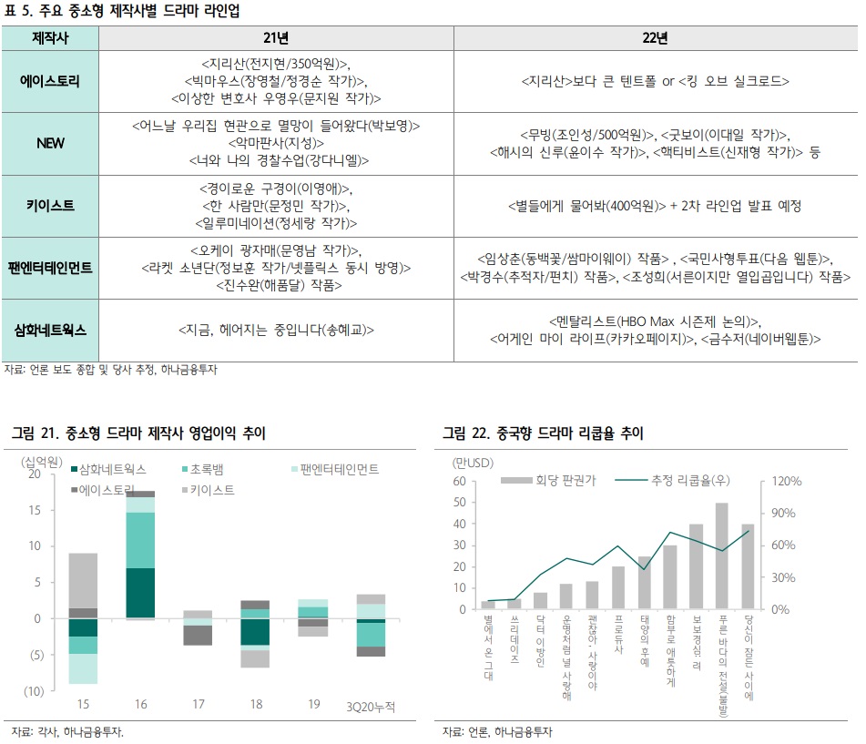 중견 제작사들인 에이스토리, NEW, 키이스트, 삼화네트웍스, 팬엔터 등의 바스켓 매수 및 중장기 투자를 추천한다. 펀더멘털이 가장 좋은 제작사는 미디어커머스라는 알파가 있는 에이스토리이며, 이익 체력 대비 가장 저평가된 제작사는 삼화네트웍스다. 영화 부문에 강점이 있는 NEW도 주목해야 한다. 에이스토리의 <지리산> 공시 이후 매달 좋아지고 있는 업황이 체감될 정도인데, 현시점 기준으로도 이익 체력이 가장 낮은 중견 제작사들의 연말 기준 최소 시가총액은 4,000억 원(순익 150억 원 *25배)에 근접할 것으로 예상한다.