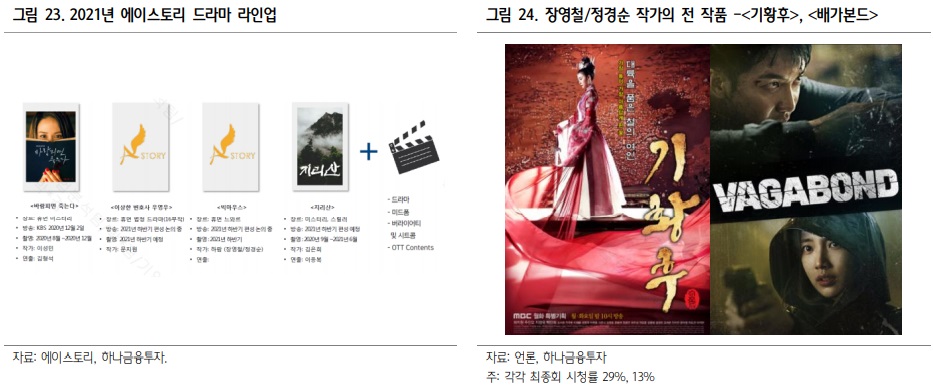 (열혈사제, 빈센조 등)의 차기작이 <지리산> 보다 더 큰 규모로 진행될 가능성이 높으며, 아니더라도 IPO 당시부터 준비 중인 IP인 <킹 오브 실크로드>가 역대 최대 규모의 제작비가 투입될 작품이 될 가능성이 있다. 올해 예상 실적도 매우 좋지만, 향후 3년을 봤을 때 올해가 실적 관점에서 가장 저점이다.