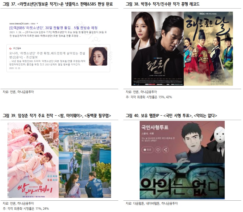 올해 제작 편수는 약 5편이다. 3월 방영 예정인 주말극 <오케이 광자매>(초록뱀 공동 제작), 백미경 작가/조성희 작가들의 작품들이 대기하고 있다. 올해 IP를 확보한 드라마는 <라켓소년단>으로 5월 SBS와 넷플릭스에서 동시 방영될 예정이다. <라켓소년단>만으로도 2010년 이후 사상 최고 수준의 영업이익(약 80억 원 내외)이 예상된다.