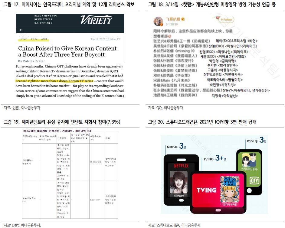 구작뿐만 아니라 최신작 기준으로는 넷플릭스를 통해 개봉한 <승리호>도 중국 개봉을 추진 중이며, 메가박스㈜플러스엠이 배급하는 황정민/현빈 주연의 <교섭>도 중국 판매를 위해 바이어와 논의 중으로 알려져 있다. <교섭>의 경우 아직 국내 미방영작임에도 콕 집어서 해당 작품의 동시 개봉 가능성이 제기되고 있다. 텐센트가 출자한 법인이 JTBC스튜디오 3자 배정 유증에 참여한 이후 나온 뉴스임을 상기할 필요가 있다. 한한령이 완화될지는 모르겠지만, 한한령 완화 이후 기대할 수 있는 결과(아이치이/유큐/텐센트의 컨텐츠 수급)들은 이미 역대 최고 수준으로 확인되고 있다. 판단은 각자의 몫이다.