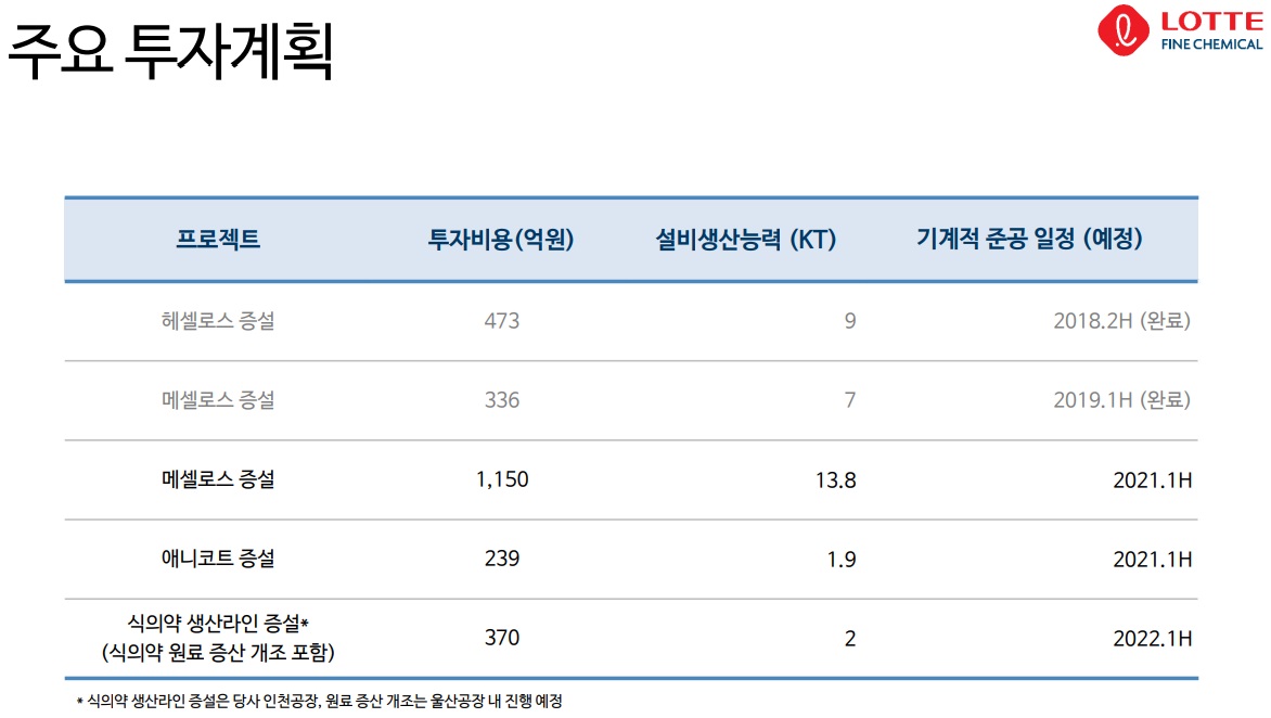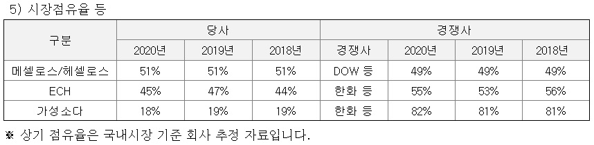 동사의 주요 Cash Cow 제품군은 셀룰로스 에테르이다. 동사는 셀룰로스 에테르부문의 마진율을 공식적으로 공표하지 않지만, 경쟁사 Dow, Shin-Etsu, Ashland, Shandong Head 등의 셀룰로스 에테르 관련 사업부문의 마진율을 고려하면, 타 범용 화학 제품 대비 차별화된 마진율을 유지하고 있는 것으로 판단된다.