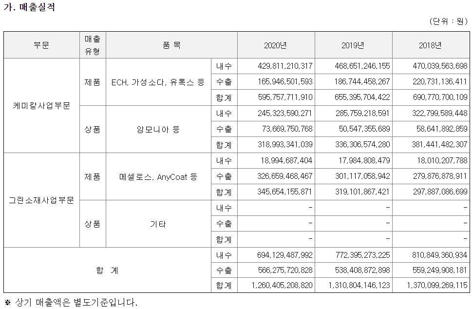 주요 제품군은 정밀화학제품(메셀로스, 헤셀로스, 애니코트, ECH), 일반화학제품(가성소다, 염화메탄, 유록스), 전자재료제품(TMAC, 토너) 등이 있음.