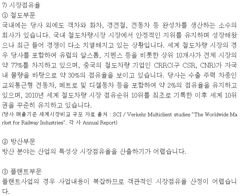 국내를 넘어 세계 37개국에 다양한 차종의 철도차량 및 핵심 전장품을 공급하고 있으며 신호, 통신 등 철도시스템 분야로 사업영역을 확대하고 있음.