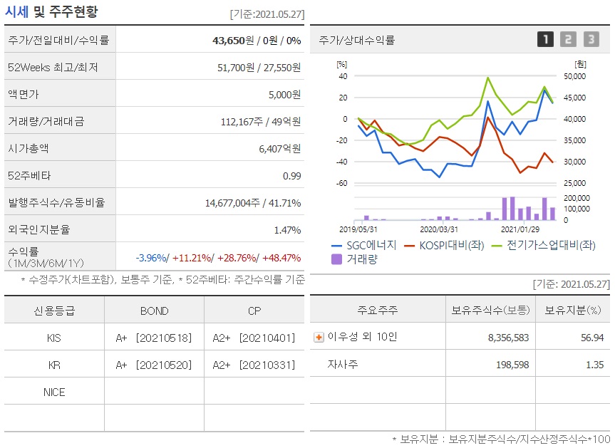 SGC에너지 목표주가 62,000원, 투자의견 매수를 제시한다. 목표주가는 2021년 예상 BPS에 PBR 1.4배를 적용하여 산출했다.