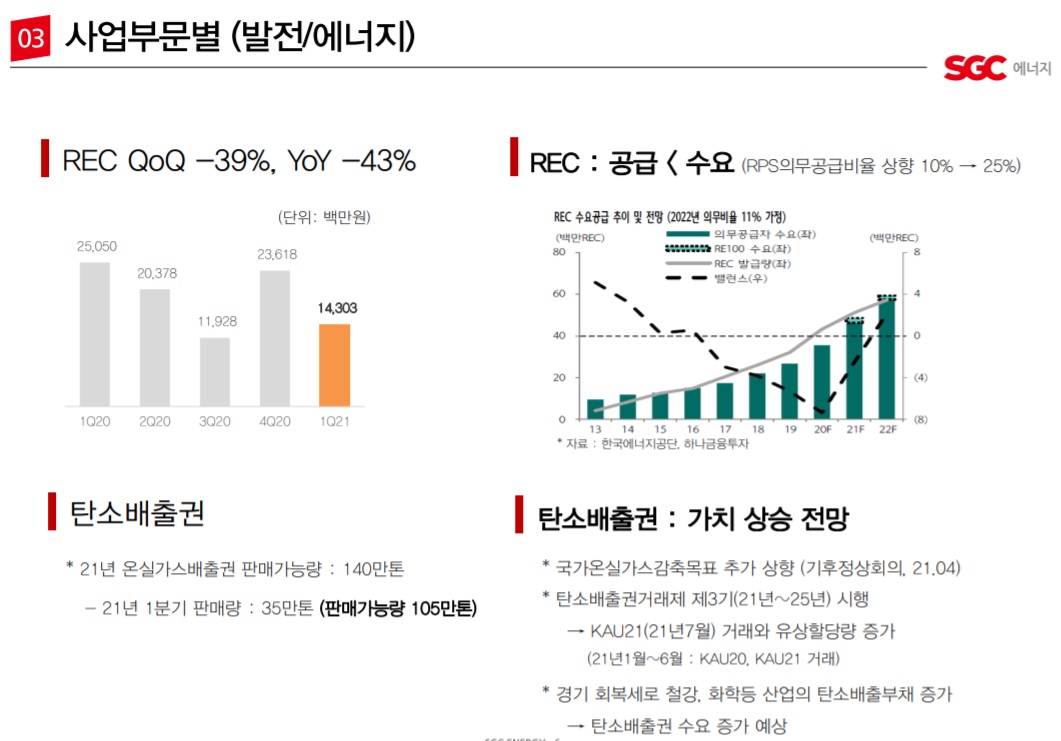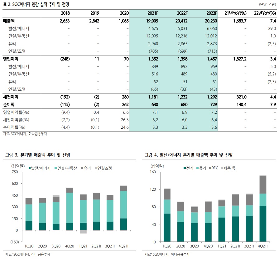 2021년 매출액은 1.9조원으로 전년대비 1,683.7% 증가할 것으로 예상된다. SGC이테크건설 실적을 연결로 인식하는 기저효과와 함께 주요 사업부문인 발전/에너지 외형성장이 기대되기 때문이다. 영업이익은 전년대비 1,827.2% 개선된 1,352억원이 예상된다. 건설/부동산 실적이 정상화되고 SMP 상승으로 발전/에너지 이익도 점차 회복되고 있다. REC는 고정계약 중심으로 매출이 이뤄지고 잇고 기준 가격 변동폭이 크지 않을 것으로 예상되고 있어 현물가격 약세에 따른 우려는 제한적이다. 온실가스 배출권 가격은 7월 이후 흐름이 관건이며 이월 가능한 물량을 감안하면 연간 원가 절감 측면에서 유의미한 기여가 가능하다. 스팀은 신규 고객 확보 이후 외형과 이익이 증가할 전망이다.