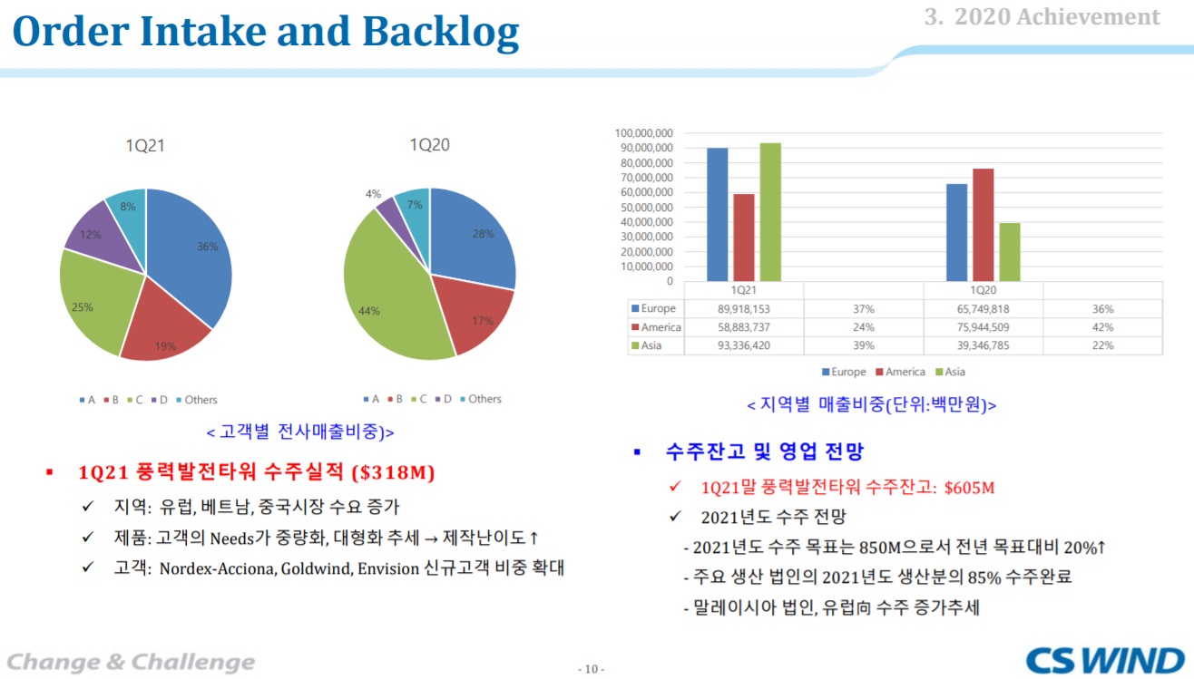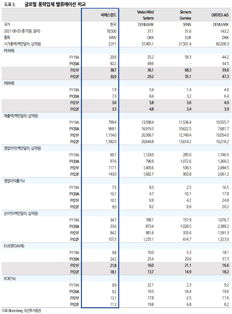 인수와 동시에 Vestas 와 5 년간 약 1.5 조원의 미국향 타워 공급계약을 체결했다. 이 물량을 기본으로 여타 터빈메이커들에게도 내년부터 공급이 시작될 것으로 판단된다. 터빈메이커들에게는 미국 내에서 풍력 타워를 수급하는 것이 절대적으로 유리한 상황이기 때문이다. 이외 씨에스윈드는 유럽, 베트남, 미국에 해상풍력 타워 및 모노파일 사업을 확대하는 계획을 진행하고 있다. 공격적인 확장정책으로 동사는 글로벌 풍력 관련업체 들 중 가장 높은 이익성장이 예상된다. 가시성 또한 높다. 높은 밸류에이션을 부여 받을 자격이 충분한 것이다. 동사에 대해 투자의견 BUY, 목표주가 110,000 원을 유지한다.