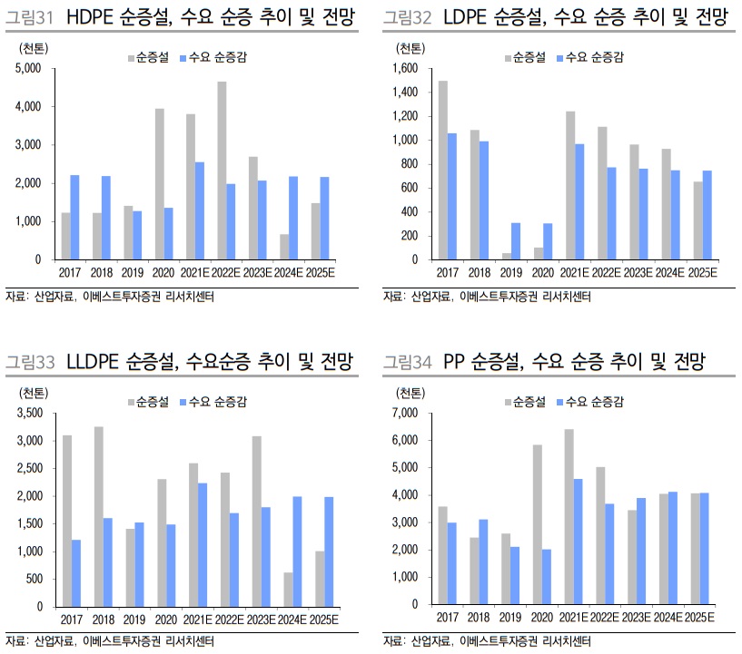 PVC 등 일부 공급 부담이 적은 제품들도 있지만 대부분 4분기 신규 증설 설비 가동이 시작될 것이다. 이에 제품 판가 하락 압력 지속으로 인한 스프레드 축소로 분기별 실적 우하향이 예상된다. 또한 2021년에 이어 2022년에도 증설 순증이 수요 순증을 초과할 것으로 예상되어 2022년 공급 과잉 가능성이 높다.