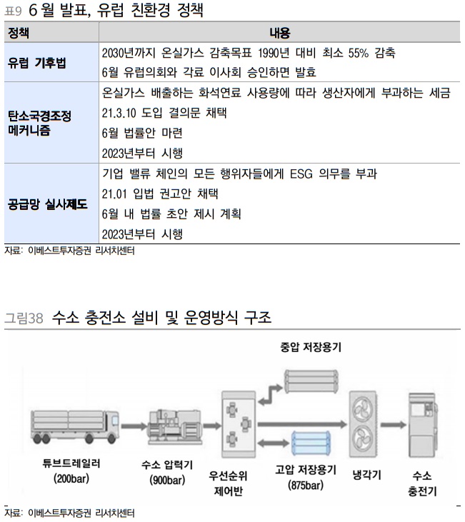 친환경 정책 중 가장 강력하게 거론되고 있는 EU의 탄소국경조정세 법률안이 6월 마련, EU 공급망 실사 제도 또한 법률 초안이 6월 내 제시될 계획이다. 그리고 미국, 일본 등도 추후 탄소국경세를 검토하고 있음을 밝혔다. 국내에서도 6월 15일, 탄소포집 관련 기술 로드맵 발표에 이어, 하반기 수소경제 관련 로드맵 등 친환경 정책 발표가 잇따를 것으로 예상된다. 이에 하반기에는 배터리에 이어 수소 관련주에도 관심을 가질 필요가 있다.