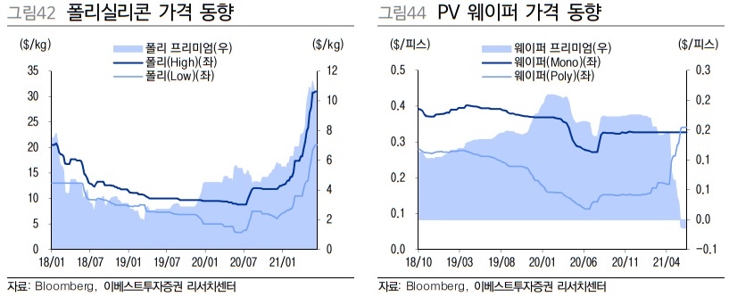 친환경 정책의 중심에 있는 탄소국경조정세 구체화로 인하여 2021년 태양광 수요에 대한 기대가 컸다. 특히, 탄소국경조정세 중 전력사용 시 발생하는 탄소배출에 대한 관세는 태양광 등 신재생에너지 설치를 통해 해결이 가능하기 때문이다. 그러나 미국의 중국 신장 위구르 관련 제재로 인하여 폴리실리콘 등 원재료 가격이 폭등하면서 모듈 가격 상승이 불가피한 상황이다. 태양광 산업 특성상, 기술보다는 경제성이기 때문에 모듈 가격 상승은 태양광 프로젝트 지연으로 이어진다.