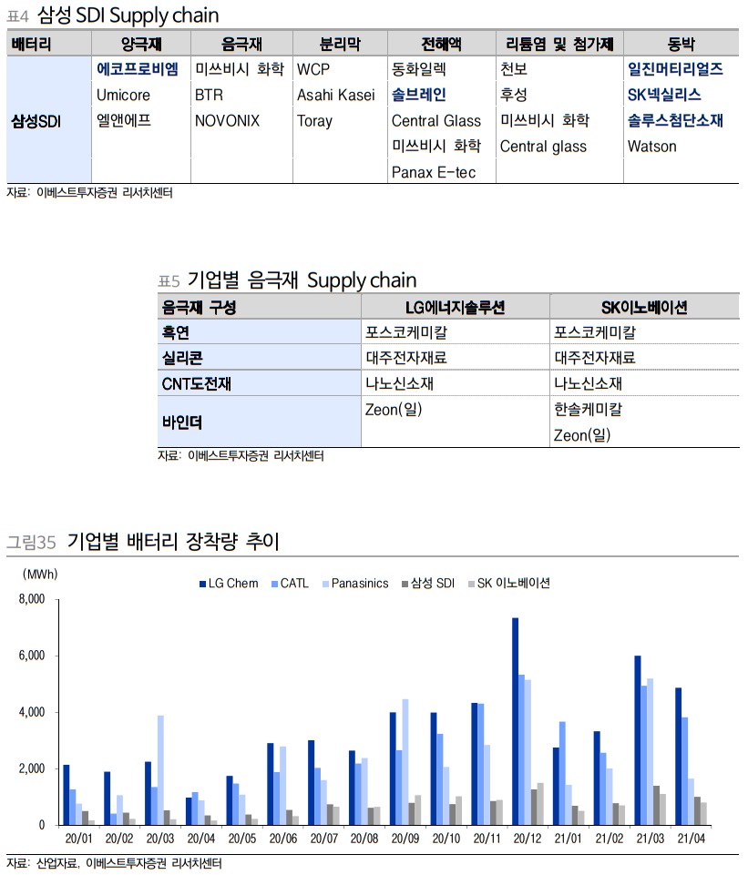 5/25 콜라보 자료를 통해, EV 배터리 하반기 모멘텀은 ‘북미 현지 투자’임을 이야기했다. 다만, 이는 배터리 소재 기업, 특히, 양극재 기업들에게 유의미할 것이다. 배터리 셀 기업의 경우, LG에너지솔루션 IPO가 하반기에 예정되어 있다. 테슬라 AI데이(7월 말 예정) 이후 배터리 셀 기업에 대한 주가 상승 기대감이 있으나 셀보다는 배터리 소재 기업 중심 비중 확대가 의미 있다고 판단된다. 그리고 배터리 셀 기업은 LG에너지솔루션 중심으로 비중을 확대할 필요가 있다.