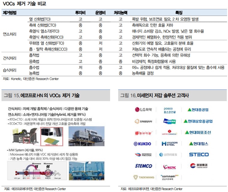 MW 기술을 활용한 VOCs 제거의 경우 국내 조선사를 시작으로 다양한 전방산업으로 고객사를 확장하는 단계이다. 제습, Dryer로 영역을 넓히는 경우 2차전지, 전자재료(IT) 등으로의 고객사 전방산업 확장이 기대된다. 계열사인 에코프로비엠(2차전지 양극재)의 생산 라인에서 테스트를 진행하고 있다.