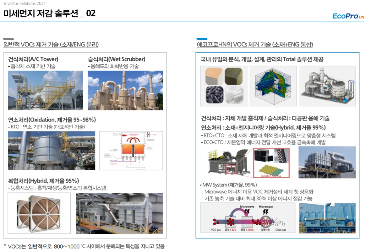 VOCs의 저감/제거에는 다양한 방식이 존재한다. 연소, 건식(흡착), 습식(흡수) 등이 대표적인 기술들이다. 고온에서 분해되는 VOCs의 특성상 연소 방식이 상대적으로 처리능력이 우수하다. 에코프로에이치엔의 기술적 우위도 연소 처리 방식에 있다.
