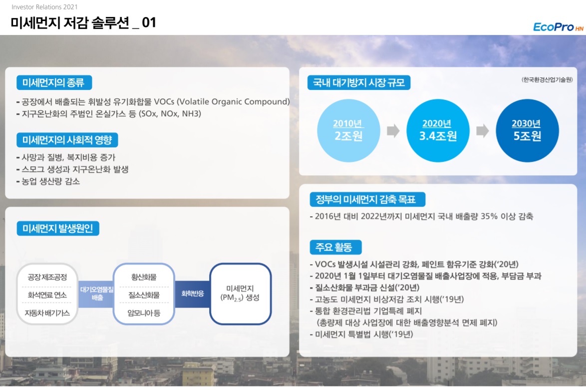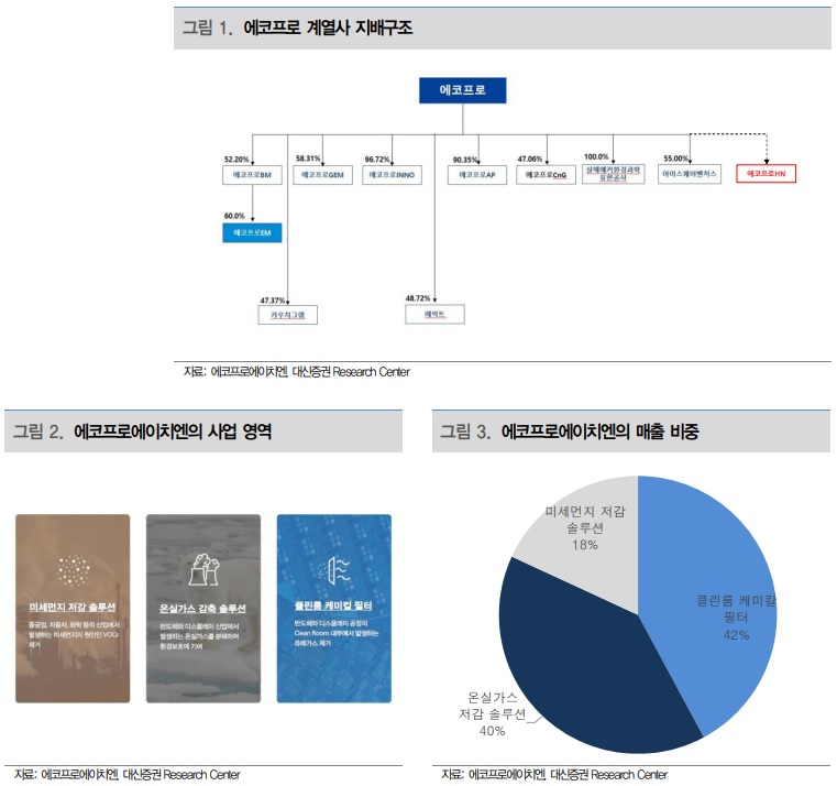 친환경을 넘어선 찐환경 기업의 등장 에코프로의 인적분할을 통해 설립(분할기일 5월 1일)된 분할 신설 회사다. 분할 전 에코프로가 영위하던 환경 사업을 승계했다. 모든 실적이 환경 사업에서 창출된다는 점이 특징적이다. 사업부는 미세먼지 저감 솔루션, 온실가스 감축 솔루션, 클린룸 케미컬 필터 등으로 구분된다. 매출 비중은 각각 18%, 40%, 42%(2020년 연간 기준) 등이다.