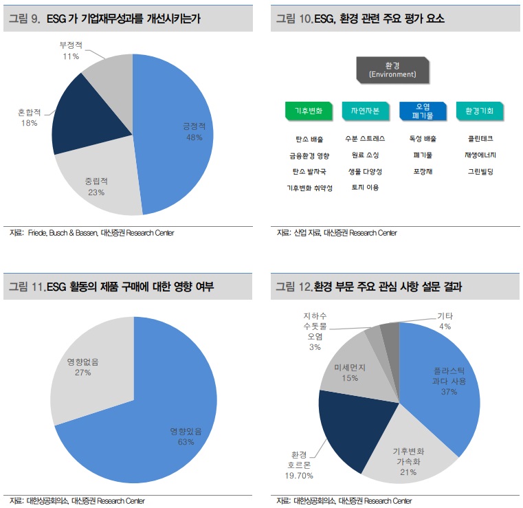 ESG의 본질은 비재무적 요소에 대한 평가다. 재무제표만으로는 표현되지 않는 분야에 대한 평가이기 때문이다. 그런데 ESG가 성장의 지표로도 인식되기 시작했다. 재무적 요소에도 영향을 준다는 뜻이다. 1) 주요국에서의 규제 강화로 환경 설비가 의무화(=비용증가)되고 있고, 2) 소비자들의 인식 변화가 제품 구매 패턴 변화(=수요 변동)로 이어지고 있다. 대한상공회의소의 조사 결과에 따르면 기업의 ESG 활동이 제품 구매에 영향을 주는지를 묻는 질문에 63%가 ‘영향이 있다’고 답했다.