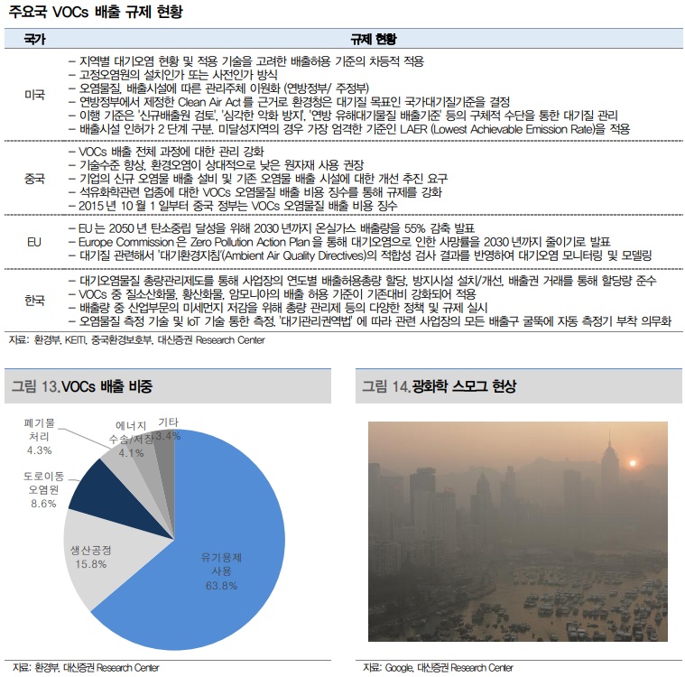 2) 비싸도 고객사가 찾는 이유? 가.성.비. 핵심 사업 중에서 향후 가장 높은 성장(2025F 연평균 매출 성장률 +53%)이 기대되는 분야는 미세먼지 저감 솔루션이다. VOCs(휘발성 유기화합물)를 제거하는 기술을 기반으로 토탈 솔루션을 제공하는 사업이다. VOCs는 대기 중으로 쉽게 증발되는 유기화합물에 대한 총칭이다. 인체에 유해(발암성)하다는 점 외에도 오존층 파괴, 지구온난화, 광화학 스모그 등의 환경 문제를 야기한다. 주요국에서 배출을 강하게 규제하고 있는 이유다. 유기용제(도장, 세정, 세탁 등) 사용 과정에서 가장 많이 배출(한국 기준 64%)된다.