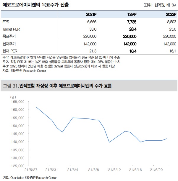 투자의견 매수, 목표주가 220,000 원으로 커버리지 개시 투자의견 매수와 목표주가 220,000원을 제시하며 커버리지를 개시한다. 목표주가는 12MF 예상 EPS에 목표 PER 28배를 적용하여 산출했다. 높은 성장성(2025F 연평균 매출액 성장률 +32%)과 전기차/2차전지, 신재생에너지 등 친황경 업종의 Valuation을 감안하면 현재 주가 수준(12MF PER 18배)은 분명 저평가 상태다. 인적분할 이전 Hidden Value의 부각이라는 측면에서 재평가에 대한 기대감은 여전하다.