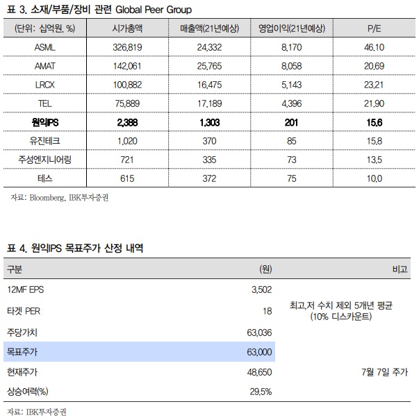 원익IPS에 대한 투자의견 매수, 목표주가 63,000원을 제시하며 커버리지를 개시한다. 목표주가 63,000원은 12MF EPS 3,502원에 5개년 PER 중 최고점인 2016년과 최저점인 2017년을 제외한 3개년 평균 PER 20배에서 10% 디스카운트한 18배를 적용해 산정했다.