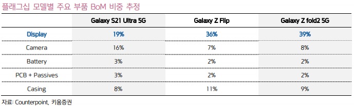 폴더블폰은 높은 디스플레이 패널 기술력이 핵심이다. 삼성전자가 2013년 MWC에서 첫 폴더블 스마트폰 공개 가능성 언급을 하고, 삼성디스플레이가 2015년 힌지 시스템 등 폴더블 적용 특허 출원한지 4년이 지나서야 실제 모델이 출시되었다. 2019년에는 갤럭시 폴드가 힌지와 디스플레이 결함으로 재출시되었고 Huawei의 Mate X 또한 출시를 연기할 정도로 관련 기술력 구현이 어렵다. 그만큼 디스플레이 패널 경쟁력이 중요하며 디바이스의 BoM(Bill of Materials) cost에서도 높은 비중을 차지한다. 세트 업체들이 평균 적으로 부품 가격의 15~20% 수준을 디스플레이 관련 부품에 할당하는 반면 폴더블폰 모델의 경우 디스플레이 관련 부품 비중이 40% 수준을 차지하는 것으로 추정한다.