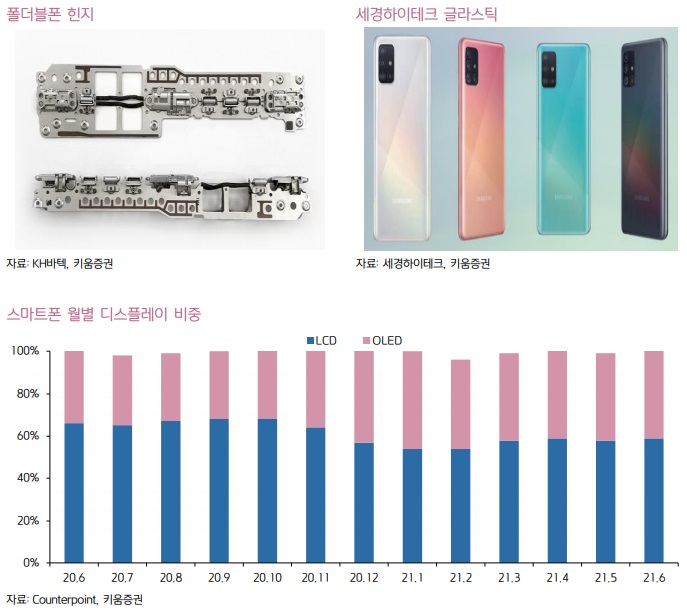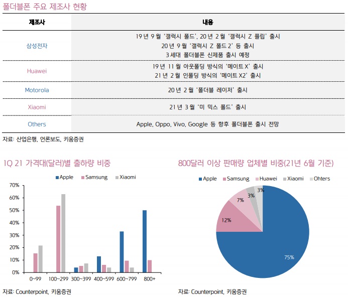 하반기 출시를 앞두고 있는 삼성의 차세대 폴더블폰의 경우 앞서 언급된 기존 모델들의 단점을 극복하고 낮아진 가격을 통해 경쟁력을 확보할 것으로 예상한다. 갤럭시 Z 폴드 3는 UDC(Under Display Camera)를 탑재해 디자인 완성도와 디스플레이 활용성을 높일 것으로 보이며 무게도 전작보다 30g가량 가벼워진다. 갤럭시 Z 플립 3는 외부 디스플레이를 전작대비 키워 가용성을 확대시킬 것으로 전망한다. 새로운 모델에 대한 기대감이 커짐에 따라 연초 이후 폴더블폰 전망치도 점차 상향되는 추세이다.
