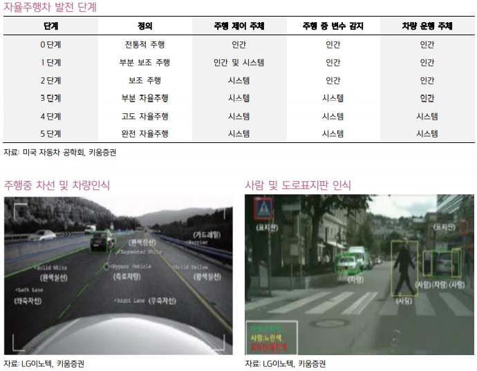 자율 주행으로 가기 위해서 자동차에 탑재되는 센서는 크게 1) 카메라 센서, 2) LiDAR 센서, 3) 레이더 센서, 4) 울트라소닉 센서로 나눌 수 있다. LiDAR, 레이더 센서, 울트라소닉 센서는 측정 거리의 차이가 있지만 거리 측정 목적이라고 볼 수 있고, 다른 센서들 대비 카메라 시스템은 거리 측정의 목적보다는 개체에 대한 인식을 위해 쓰인다고 볼 수 있다. 즉, 카메라 탑재 증가는 자율 주행 능력 향상 등을 위한 목적보다는 자율 주행 등급 상향에 따른 안전에 초점을 맞춘 것이라 볼 수 있다.