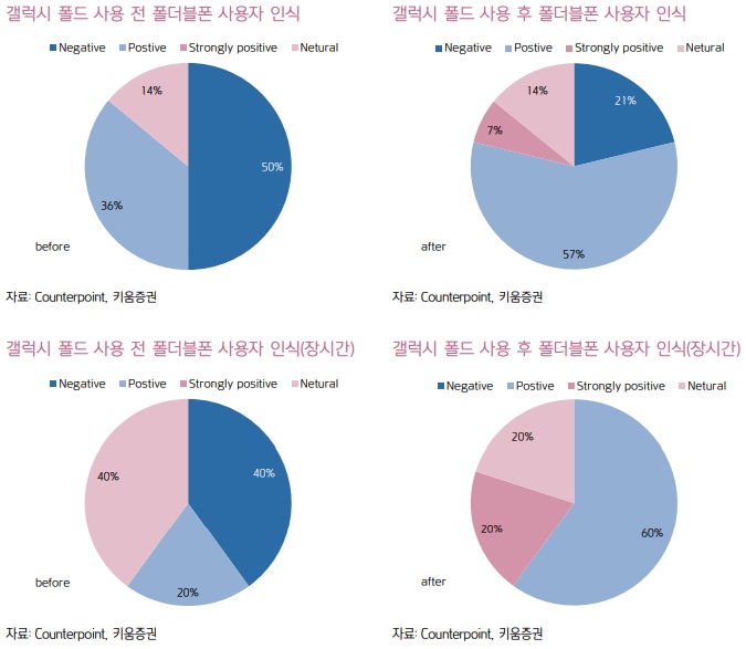 폴더블폰 출하량은 처음 선보인 19년 50만대를 기록한 이후, 20년 300만대를 기록했다. 초기 시장은 디스플레이 패널 생산능력 제약 외에도 무거운 무게와 높은 가격을 이유로 시장 기대치 대비 낮은 수치를 기록했다. 시장 조사기관 Counterpoint가 진행한 인터뷰를 통해 초기 폴더블폰 사용자 경험을 조사해보면 가장 불만족스러운 요소로는 무겁고, 두껍다는 의견이 많았으며 적용 UI 개선과 컨텐츠 부족 의견도 있었다. 전면 카메라의 큰 노치 디자인과 같은 디자인에 대한 불만족 의견도 있었다. 다만 사용 후 사용자들의 폴더블폰에 대한 인식은 긍정적으로 변화했는데, 주 요인은 Multi-tasking과 동영상 시청이 원활한 큰 화면 등의 특징으로 사용 기간이 길어짐에 따라 사용자들의 폴더블폰 만족도는 높아지는 것으로 나타났다.