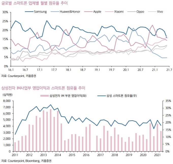 삼성전자 IM(IT·모바일) 부문 영업이익은 2010년 이후 삼성전자의 스마트폰 점유율 상승과 함께 가파르게 올랐으며, 2013년 3분기에는 삼성전자 스마트폰 점유율이 32%를 기록하면서 IM 부문에서만 분기 영업이익 6.7조원을 기록했다. 다만, 자국 내 수요를 바탕으로 외형과 기술력을 확보한 중국 업계가 글로벌 시장 지배력을 지속적으로 강화했으며 동시에 프리미엄 모델에서는 Apple이 영향력을 키우면서 삼성의 글로벌 점유율은 20% 전후로 하락했다. 이에 따라 삼성전자 IM부문 수익도 최근 몇 년 동안 박스권에서 등락을 이어오고 있다.