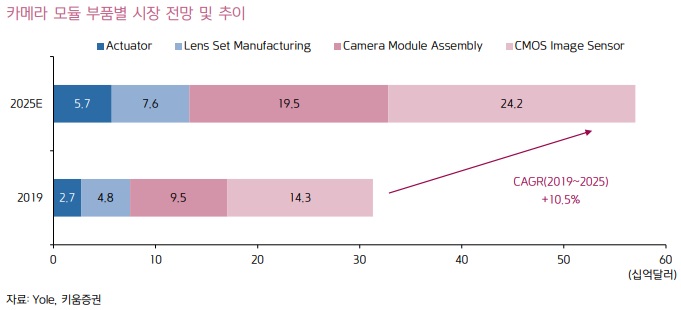 스마트폰 시장이 성숙기에 진입하였음에도 카메라 성능에 대한 기대 수요가 높아지면서 제조사들도 카메라의 고화소화, 다기능화를 통해 차별화 전략을 추구하고 있다. 카메라 모듈 시장은 Dual, Triple, Quad, Penta 카메라로 진화하면서 카메라 탑재수가 증가 추이에 있고, 화소수 위주의 기술 경쟁에서 나아가 ToF(Time of Flight) 카메라와 같이 3D, AR/VR 콘텐츠 연계 등으로 기술 발전이 이루어지고 있다. 주요 스마트폰 제조사들의 플래그십 모델에는 1억 화소 이상의 카메라 모듈이 적용되고 있으며 중저가 모델 스펙 또한 함께 상향 중이다. 카메라 모듈 업체는 고성능 카메라 트렌드 지속에 따라 카메라 모듈 개수에 대한 수요와 판매 단가가 동반 성장되고 있으며, 스마트폰 성숙기 진입 후에도 시장 성장이 예상되는 대표적인 분야다. 리서치 기관 Yole에 따르면 2019년 카메라 모듈 시장은 313억 달러(약 36조원) 규모에서 2025년 570억 달러(약 65조원)로 연평균 10.5% 성장을 전망했다.