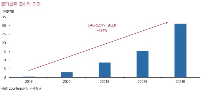 출시 3년째에 접어드는 올해부터 적극적인 대중화 전략과 중화권 업체 진입 등을 통해 시장은 가파르게 성장할 것으로 판단된다. Counterpoint에 따르면 폴더블폰 출하량은 올해 860만대(YoY 190%)에 이어 22년 1,540만대(YoY 79%)를 전망한다. Apple의 폴더블폰 출시가 예상되는 23년에는 3,112만대(YoY 102%)까지 출하량이 증가할 것이다. 올해 폴더블폰 출하량 전망이 연초에 500~600만대 수준이었음에도, 신제품 출시가 다가옴에 따라 전망치도 점차 상향되었다는 점이 주목된다.