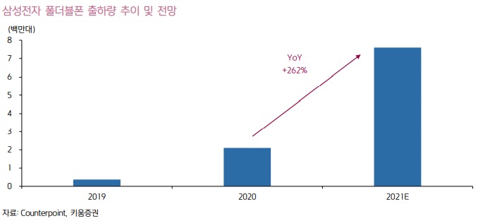 현재까지 삼성전자가 폴더블폰 기술적 측면에서 가장 앞서 있고, 핵심 부품인 디스플레이 패널 수급에서도 타사 대비 유리한 위치에 있어 미래 폼팩터 경쟁에서 한 발 앞서 있는 것으로 판단된다. 올해 삼성 폴더블폰 출하량 전망치도 기존 617만대에서 760만대(YoY 262%, 점유율 88%)로 상향되었다. 모델별 출하량은 갤럭시 Z 폴드 시리즈가 약 250만대, 갤럭시 Z 플립 시리즈가 약 500만대 수준을 전망한다.