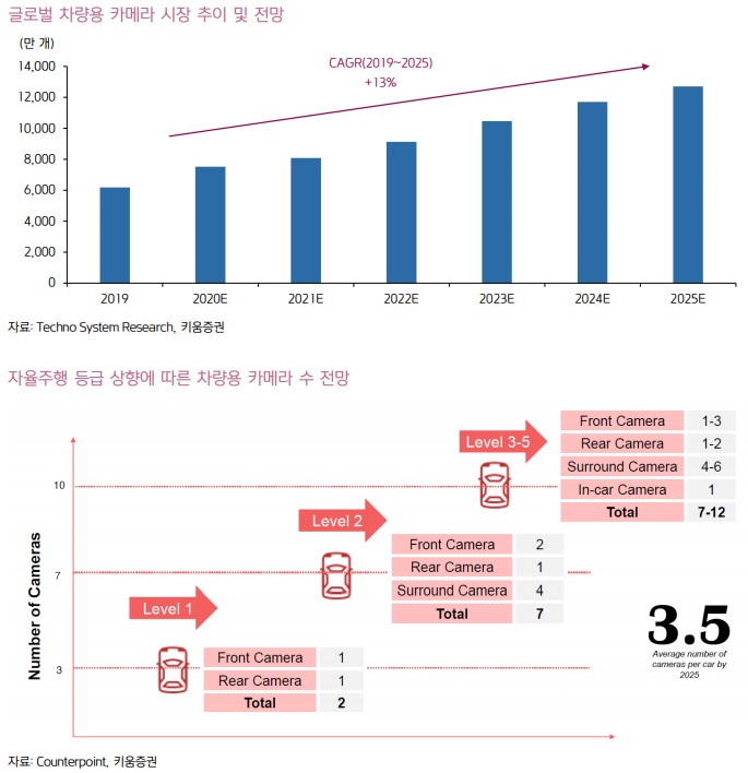 자동차 전장용 카메라 시장 확대는 모바일 카메라 모듈 사업을 통해 기술적 경쟁력을 갖춘 국내 카메라 모듈 업체들에게 새로운 성장 모멘텀이다. 연간 스마트폰 판매대수가 글로벌 기준 13억대(2020년 기준)인 것 대비 연간 1억대 미만의 글로벌 자동차 판매량은 작은 규모이지만, 상대적으로 높은 단가와 자율주행 시장 개화에 따라 차량 한 대 당 들어가는 카메라 대수 증가세가 향후 자동차용 카메라 시장 성장성을 높여준다. 전기 자동차와 자율주행 시대 도래에 따라 안정장치 의무화 등으로 자동차의 필수 부품으로 인식되고 있어 빠르게 수요가 증가하고 있다. 시장 조사 기관 Techno System Research에 따르면, 글로벌 차량용 카메라 시장은 2019년 6,175만개에서 2025년 1억 2,707만개로 늘어날 것으로 전망했다.