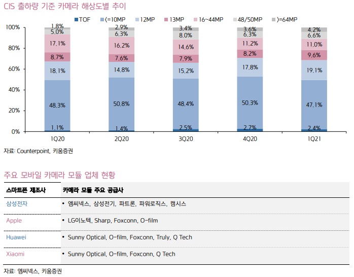 삼성전자 최신형 플래그십 모델 갤럭시 S21 울트라는 1억800만 화소의 광각렌즈에 1000만 화소 망원레즈 2개, 1200만 화소 초광각 렌즈를 적용한 쿼드 카메라를 장착하였다. 삼성전자는 최근 공개한 갤럭시 A52/A72 모델에도 6400만 화소의 카메라를 탑재하면서 향후 보급형 모델로까지 카메라 고급화는 확대될 것으로 예상된다. 상대적으로 고부가가치 제품이 플래그십 모델 탑재 위주에서 중저가 스마트폰으로 적용이 확대됨에 따라 국내 중소형 모바일 업체로의 낙수효과도 커질 것으로 전망한다.