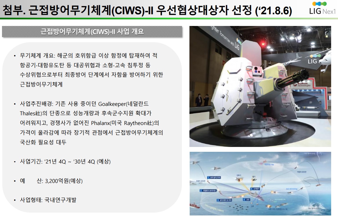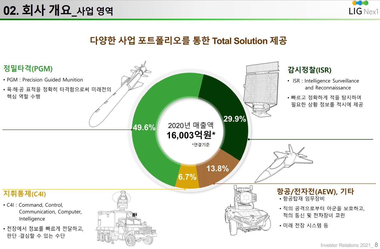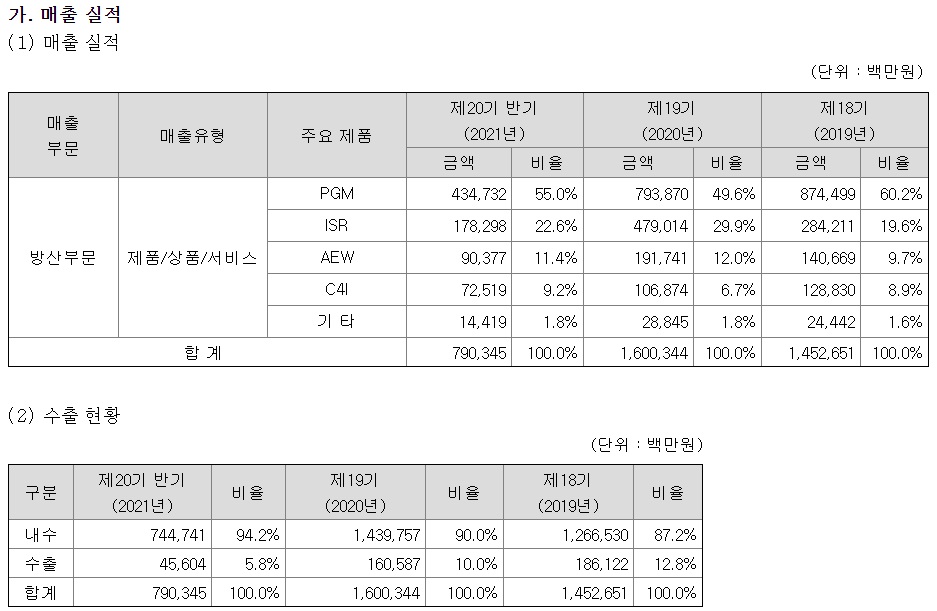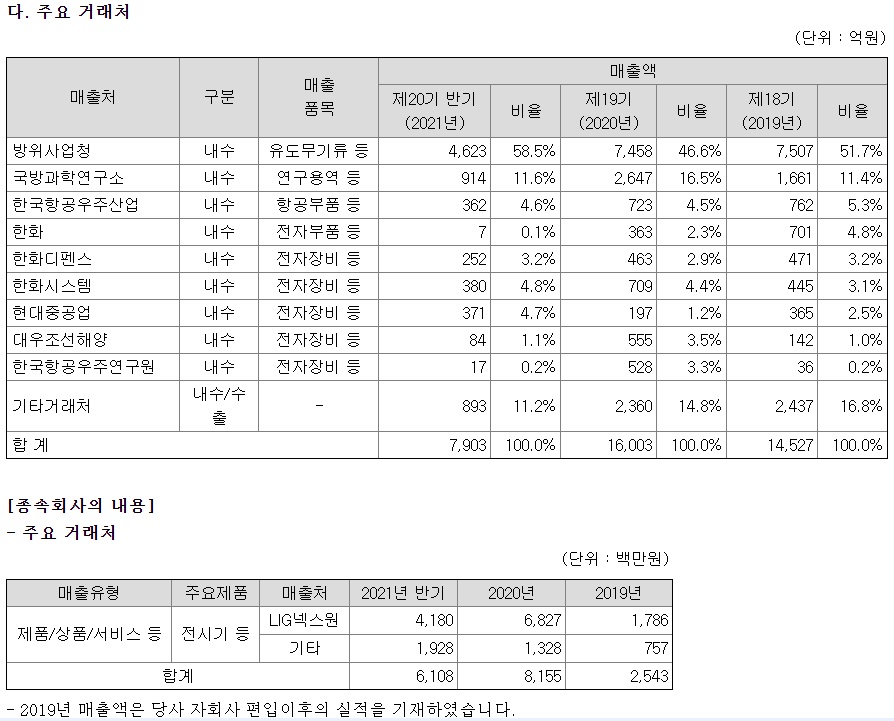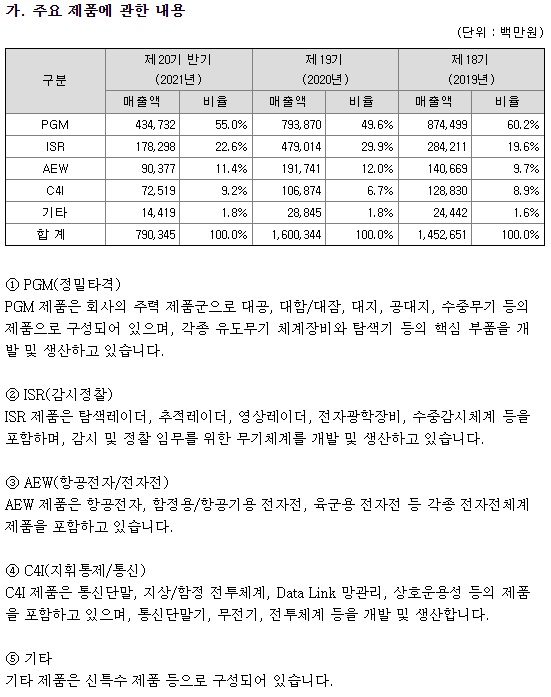 동사는 주요 고객인 한국정부(방위사업청, 국방과학연구소, 각군 등)와 계약을 통해 제품의 연구개발, 생산, 성능개량, 후속지원 등을 주요 사업임.