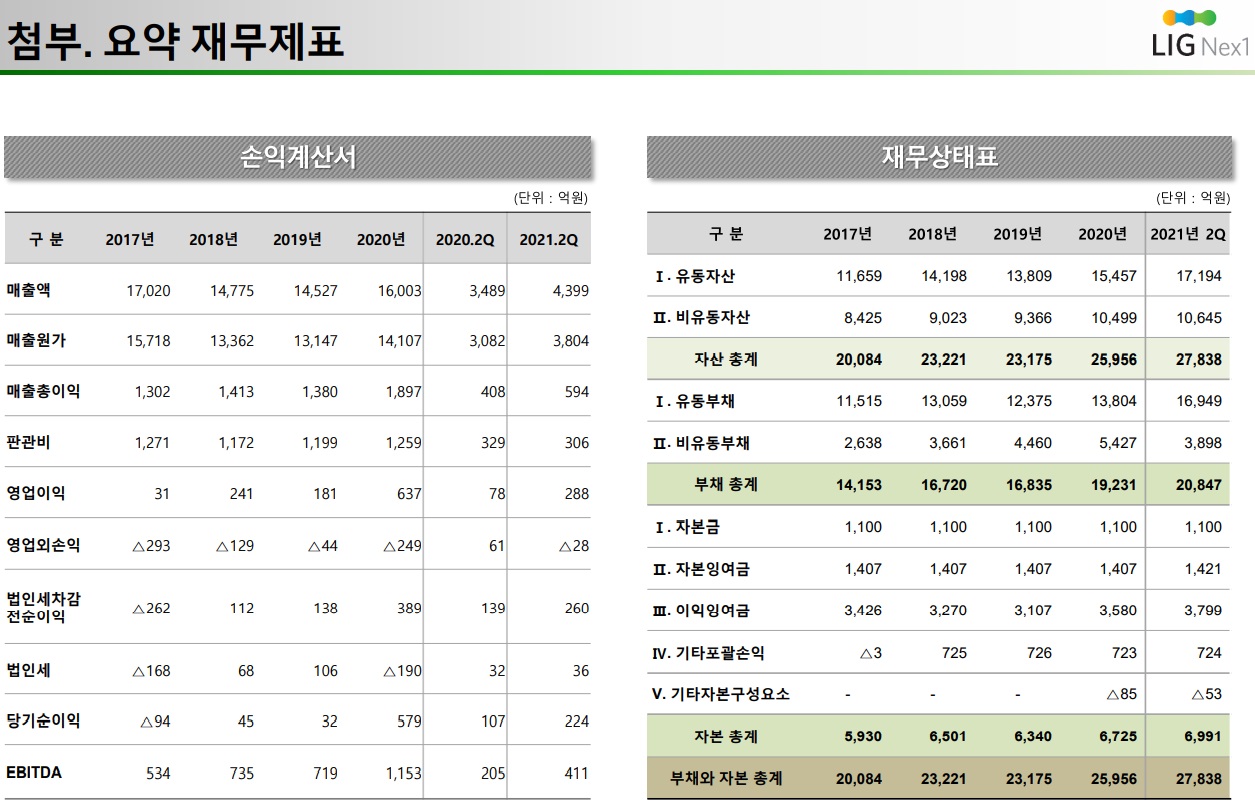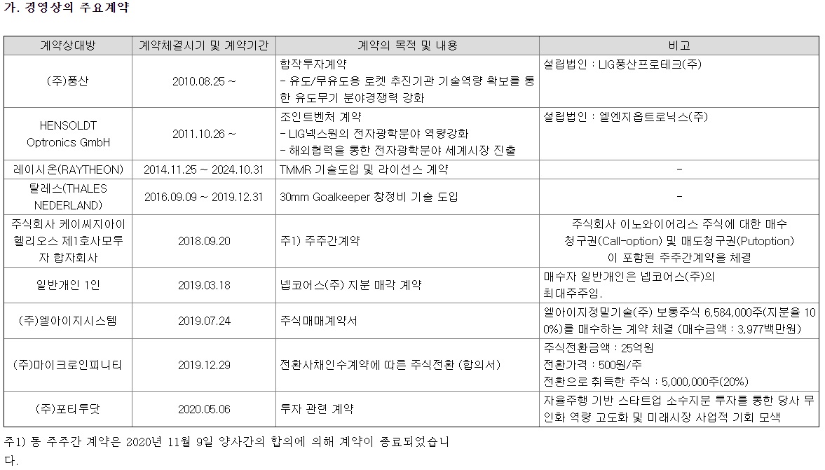 동사는 LG이노텍 주식회사로부터 방위산업 부문을 영업양수받았으며, 방산물자의 연구개발, 제조, 정비 및 판매 사업을 주된 영업으로 영위.