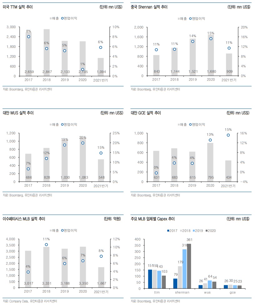 글로벌 MLB 시장은 약 2조원 규모로 추산되고 미국 TTM, 대만 Gold Circuits, 중국 Shennan과 WUS, 일본 Kyocera, 그리고 국내 이수페타시스(007660 KQ)와 대덕전자(353200 KS) 등 6개 내외 업체가 시장 수요 70% 이상을 담당하고 있다.