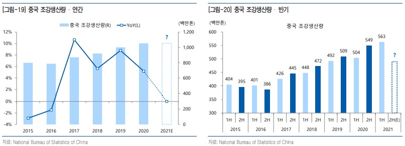 2021년 상반기 중국 조강생산량은 5억 6,333만톤으로 전년대비 +11.8% 증가했다. 2020년 연간 조강생산량은 10억 5,300만톤이었으며 상반기와 하반기 각각 5억 387만톤, 5억 4,913만톤으로 추정된다. 2021년 조강생산량이 2020년 수준을 넘지 않기 위해서는 하반기 조강생산량이 전년대비 -11%, 상반기대비 -13% 감소해야 한다는 뜻이다. 인위적인 감산이 없다면 쉽지 않은 달성조건이다.