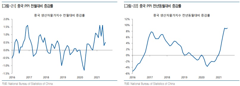 철강산업과 관련된 원자재 가격 역시 2020년 2분기부터 빠른 속도로 상승했으며 그 추세는 2021년 1분기까지 이어졌다. 중국 생산자물가지수(PPI)는 2020년 6월부터 2021년 4월까지 단 한 번도 전월대비 하락하지 않고 상승 또는 유지하는 모습을 보였다. 전년동월대비로는 2021년 1월 증가세로 돌아선 뒤 4월까지 증가 폭을 키워갔다.