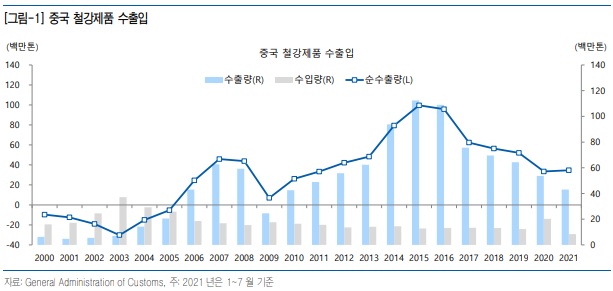 더군다나 2021년은 전년대비 순수출 규모가 증가하고 있는 중이다. 2021년 1~7월 중국 철강제품 수출량은 4,305만톤으로 yoy +31% 증가했으며 같은 기간 철강제품 수입량은 839만톤으로 -16% 감소했다. 결과적으로 순수출량은 +51% 증가했다. 2021년 1~7월 중국 철강제품 순수출량은 3,466만톤으로 2020년 연간 전체 수치인 3,344만톤을 넘어선 상황이다.