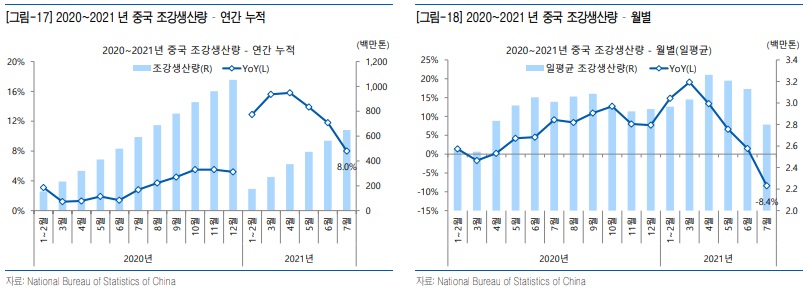 하반기 시작을 알린 7월 조강생산량은 yoy -8% 가량 감소한 것으로 나타났다. 하지만 7월 초 중국 공산당 창당 100주년 기념 행사에 따른 일시적 제재가 있었다는 점을 감안한다면 탄소배출 축소와 관련된 감산과는 다소 거리가 있다고 할 수 있다.