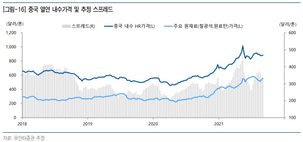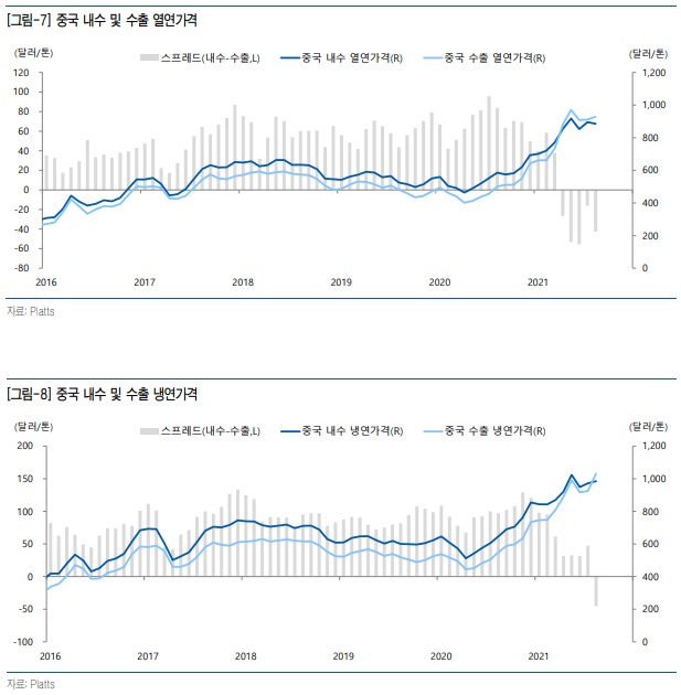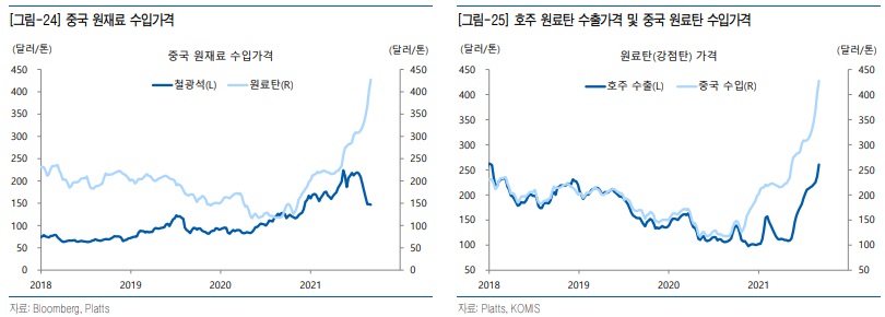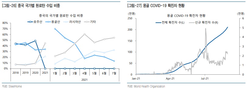 수입에서 가장 많은 비중을 차지했던 호주산과 몽골산이 정치적 이유와 COVID-19로 수입이 어려워졌고 다른 판매처를 찾는 과정에서 원료탄 가격이 급등한 것이다. 앞서 언급한 바와 같이 일반적인 상황 하에서 원재료 가격 상승은 긍정적이지만 2020년부터 이어진 상승은 중국 철강업체에 원가 부담을 주고 있어 긍정적인 요인은 아니다.