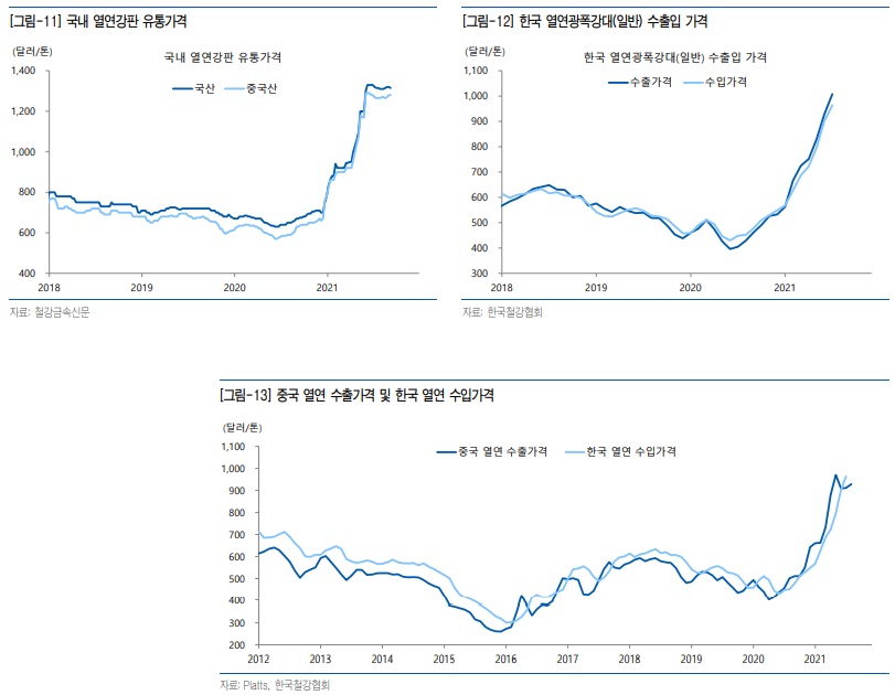 한국 열연 수입가격은 중국 열연 수출가격에 1~2개월 후행 하는 것을 확인할 수 있다. 따라서 2020년 7월부터 2021년 7월까지 지속적으로 상승했던 한국 열연 수입가격은 8월부터 상승세가 둔화 또는 소폭 약세로 돌아설 여지도 있다. 하지만 중국 열연 수출가격이 높은 수준을 유지하고 있는 바 큰 폭의 수입가격 인하는 없을 것으로 사료된다.