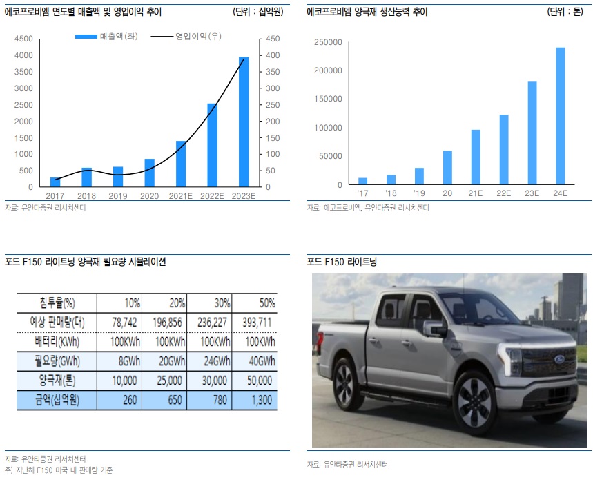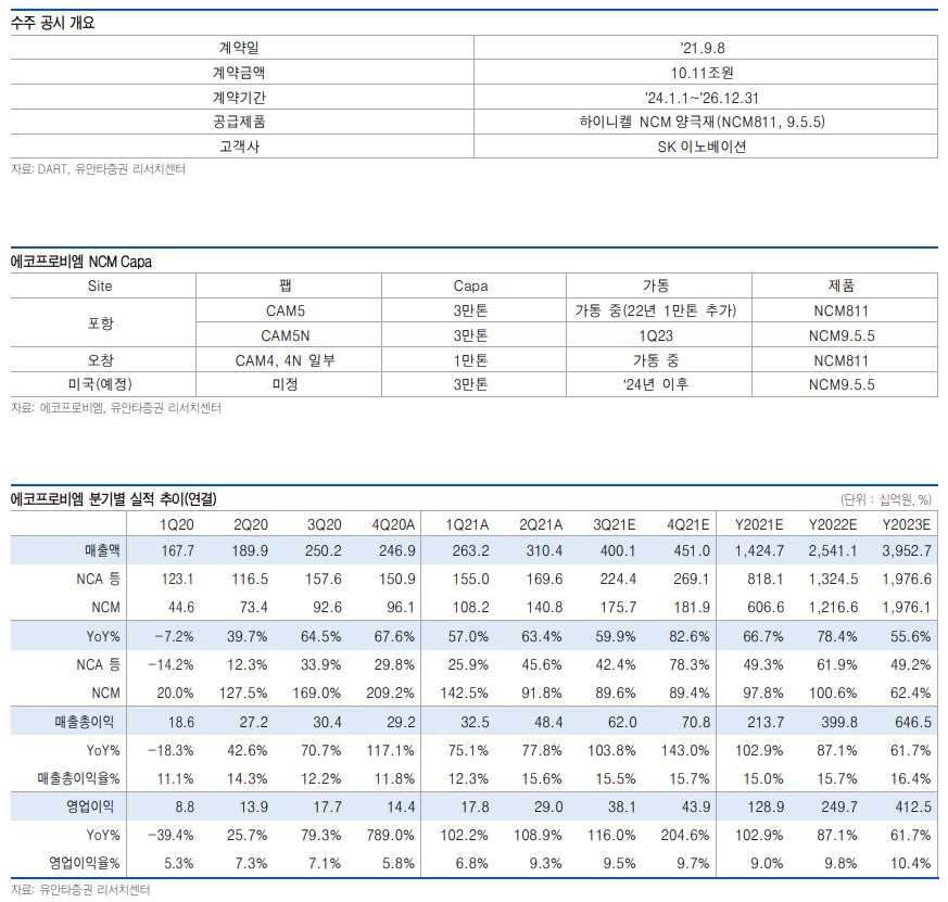 SK이노베이션(이하 SKI)향 하이니켈 NCM 양극재 10.1조원 수주 공시. 지난해 초 2.7조원(’20.1) 수주 이후 두 번째 대규모 수주. 기대했던 포드 전기 픽업트럭(F150 라이트닝 등)향 NCM9.5.5 공급이 포함된 것으로 파악. 당사는 지난 리포트(7/15)를 통해 10조원 수주 가능성을 언급한 바 있음. 공급 기간은 3년간이며, ‘24년부터 매출 반영 예정. 이번 수주 건은 1) ‘24년 이후의 중장기 성장기반 확보, 2) 삼성SDI에 이어 SKI의 양극재 메인 벤더 등극 두 가지 측면에서 중요한 의미를 지님