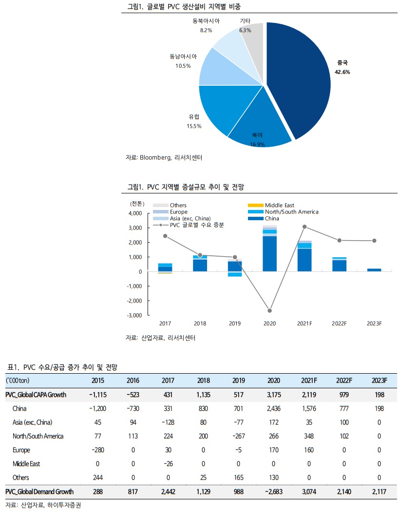 석탄가격 강세의 수혜가 기대되는 첫 번째 제품은 PVC 이다. 글로벌 전체 PVC 생산설비에서 중국이 차지하는 비중은 약 43%로 가장 크다. PVC 를 생산하는 방법은 에틸렌을 염소와 반응시키는 EDC 공법과 카바이드(석탄)에서 아세틸렌을 생산해 염소와 반응시키는 크게 2 가지가 있는데, 전자는 국내와 북미 등 대부분 업체들이 택하고 있는 공법이고, 후자는 주로 중국 업체들이 적용하고 있다.