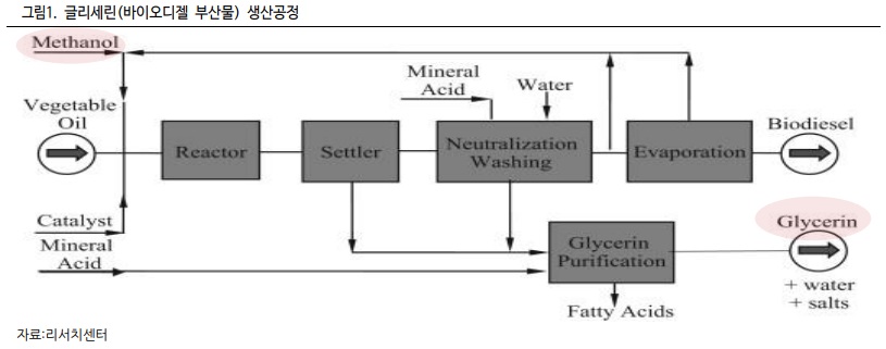 중국 석탄가격 강세의 수혜가 기대되는 두 번째 제품은 ECH 를 꼽을 수 있겠다. ECH 는 크게 프로필렌 기반과 글리세린 기반으로 생산하는 두 가지 방법이 있다. 글리세린은 그 자체로 생산되는 제품이 아니라, 바이오디젤을 생산하는 과정에서 발생하는 부산물이다. 바이오디젤은 식물성 기름 또는 동물성 지방의 화학처리를 통해 생산되는데, 그 과정에서 메탄올도 함께 투입된다. 따라서 글리세린 기반으로 ECH 를 생산하는 설비 또한 메탄올 기반이라고 볼 수 있다.