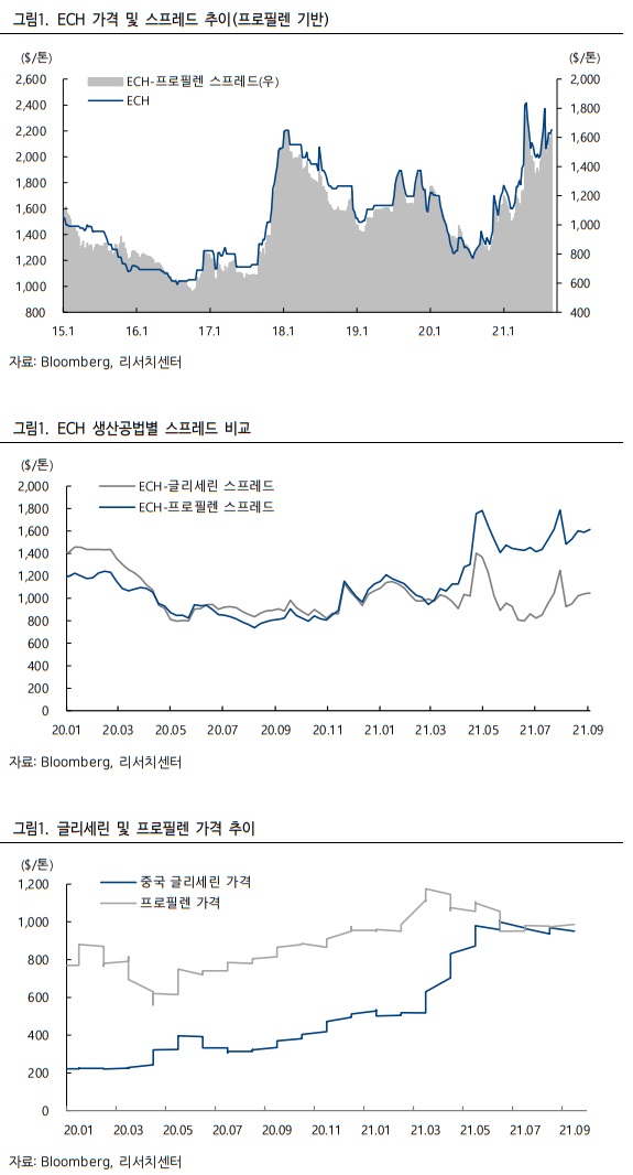 2020 년 말까지만 하더라도 글리세린 공법은 프로필렌 공법보다 마진이 더 높거나 비슷한 수준이었으나, 2021 년 이후 스프레드는 큰 폭으로 벌어졌다. 프로필렌 가격 약세 영향도 있었으나, 글리세린 가격이 급등한 것이 더 주요한 원인이었다. 참고로 글리세린 가격은 2021 년 1 월 톤당 $530 에서 9 월 현재 $970 까지 상승했는데, 연초 대비 9 개월 동안 약 +83.2% 급등한 것이다.