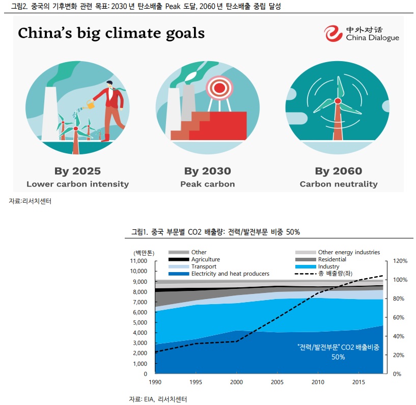 중국의 석탄생산 규제 강화는 기후변화 대응과 관련해 중국 정부가 제시하고 있는 2030 년 탄소 배출량 Peak 도달, 2060 년 탄소 배출량 중립이라는 목표를 달성하기 위한 초석이기도 하다. 특히 중국 전체 이산화탄소 배출량의 약 50%는 전력과 발전에서 발생하고 있는데, 전력과 발전부문의 석탄 의존도가 60~70% 수준에 달함을 고려하면, 중국 내 석탄에 대한 생산 규제 강화는 당연한 처사이기도 하다.