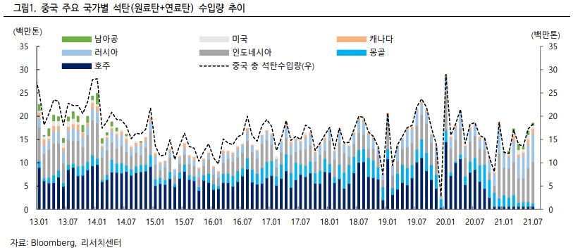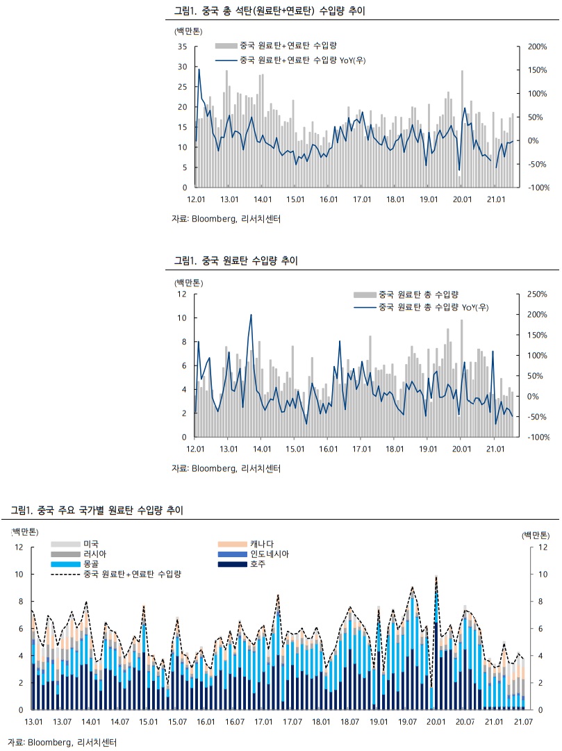 중국은 호주의 빈 자리를 인도네시아와 러시아 등을 통해 채우고 있고, 2021년 2월 처음으로 남아공에서도 연료탄 구매를 시작하였다. 그러나 2021 년 7 월 누적 기준 중국 총 석탄 수입량은 104.4백만톤으로 2020년 7월 누적 기준 135.7백만톤 대비 -23% 낮은 수준이며, 원료탄의 경우 같은 기간 -42.7% 감소하였다. 중국 자체 생산량과 호주산 수입 감소를 채우기에는 역부족인 상황인 것이다.