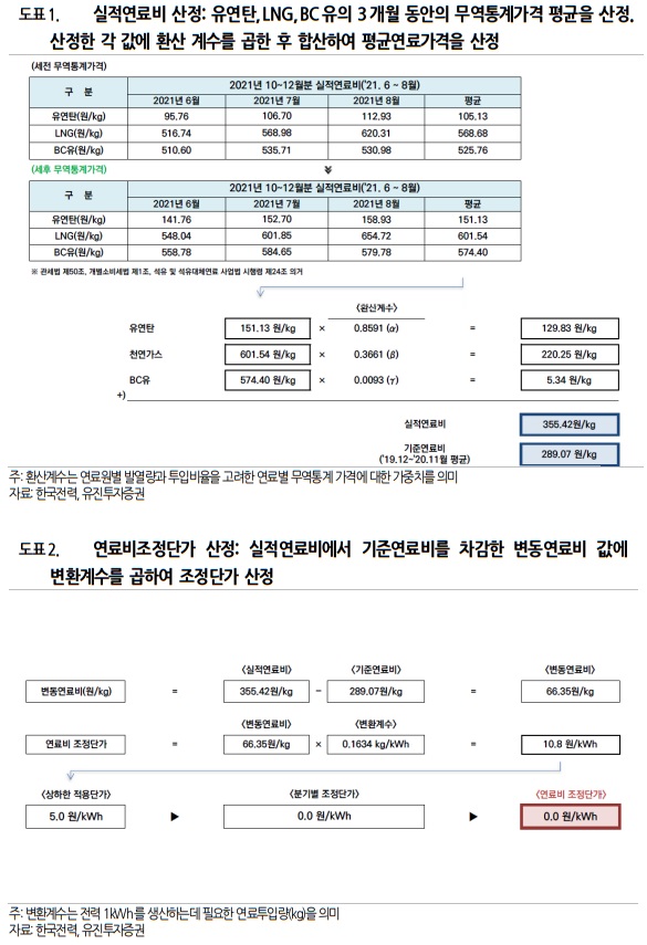 한국전력은 4 분기 연료비조정단가를 +0 원/kWh 으로 발표(3Q21 대비 +3 원/kWh). 원가연계형 요금제는 기준이 되는 지난 1 년(19.12~20.11)의 기준연료비에 직전 3 개월 연료비 변화를 분기별로 반영하며, 상하한을 기준연료비 대비 -5~+5 원/kWh, 전분기 연료비 대비 -3~+3원/kWh으로 조정. 4Q21 실적연료비는 355.42원/kg로 기준연료비 대비 +11원/kWh 인상이 필요했으나, 상하한 제한으로 +3 원/kWh 조정. 남은 +8 원/kWh 은 추후 인상 명분으로 활용될 예정