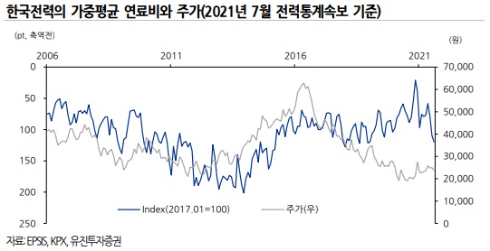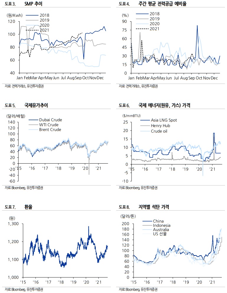 이번 발표는 당사의 기존 4 분기 요금 추정과 동일하므로 전력판매단가로 인한 연간 영업이익의 변화는 발생하지 않음. 그래도 요금제가 정상적으로 작동하고 있다는 점은 투자 심리에 긍정적인 시그널로 작용할 전망. 또한 당사는 연초이래 급등한 에너지가격도 연말까지 박스권을 지속할 것이라고 예상해 실적과 주가 모두 2021 년 하반기가 바닥이라고 판단. 당사 추정 국제유가 밴드는 70~75 달러/배럴이며, 유연탄도 중국의 석탄 공급정책이 시행되며 180 달러/톤을 고점으로 하향 안정화되어 2022 년 투입단가 하락을 예상.