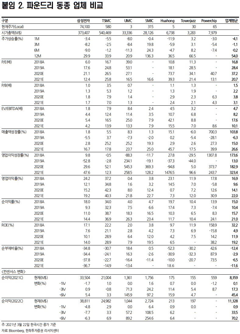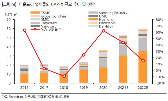 TSMC가 향후 3년 간 1,000억 달러 투자를 언급했고, 인텔이 200억 달러를 투자해 파운드리 사업에 진출하기로 했으며, 삼성전자도 미국에 170억 달러를 투입해 신규 공장을 짓는 등 천문학적인 투자 발표가 줄을 잇고 있지만, 공급 부족이 단기간 내에 해결되기는 어려워 보인다. 시장에 매물로 나온 지 오랜 시간이 지나도록 아무도 관심을 보이지 않았던 글로벌 파운드리(GF)를 인텔이 인수하겠다고 나섰지만, GF는 그 제안을 거절한 채 IPO를 준비하고 있다. 10여 년 전부터 추가 증설을 하지 않았던 8인치 파운드리마저도 수요가 증가해 웨이퍼 단가가 천정부지로 오르고 있다. 2014년까지만 해도 만성 적자에 시달리던 DB하이텍은 그 이후 주가가 10배 이상 올라 한때 시가총액이 3조 원에 육박했다.