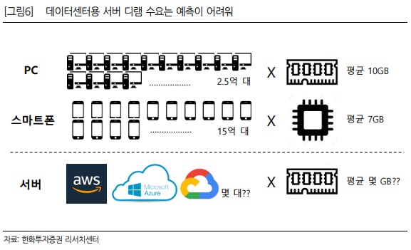 기본적으로 디램 수요는 각 어플리케이션의 판매량과 대당 디램 콘텐츠 용량을 곱한 것을 모두 더한 값으로 산출된다. PC와 스마트폰은 이런 산술적인 계산이 어느 정도 가능하다. 그러나, 서버 판매량은 집계하기 어렵다. 과거에는 전통 서버 기업인 HPE, Dell 등이 판매하는 숫자만 집계하면 됐지만, 지금은 데이터센터 기업인 Big3의 서버 구매량이 가장 중요해졌다. 이 서버들은 자체 설계되어 OEM 생산되므로 실제 얼마만큼의 서버가 제작되는지 알 길이 없다. 설사 안다고 해도 일반적인 서버와 다른 형태이기 때문에 대당 디램 콘텐츠 용량이 달라 전체 서버 디램 수요를 집계하기에는 한계가 있다. 서버 수요가 블랙박스 형태를 띠기 때문에 Big3의 입김에 좌지우지될 수밖에 없다는 점도 현재의 불확실성을 키우고 있다.